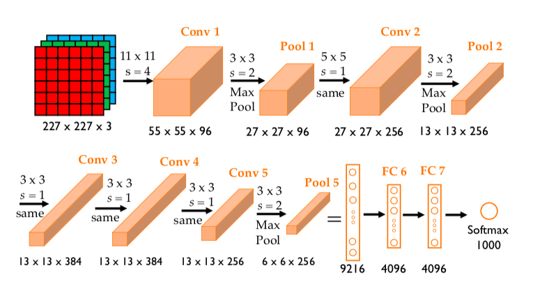 5개의 Conv Layer와 3개의 Fully Connected Layer로 구성되어 있으며 총 6천만 개 파라미터와 1000개의 softmax 함수로 아웃풋이 배출됨