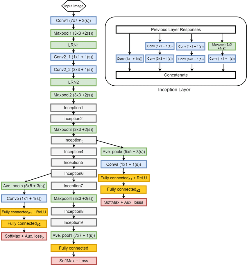 기본 레이어를 중심으로 양쪽에 보조 분류기(auxiliary classifier)가 있는 것을 볼 수 있음.