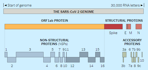 전체 코로나 바이러스 게놈과 그것이 암호화하는 단백질은 아래와 같다.