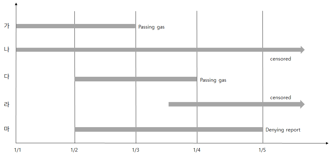 (연구 도중 추적이 안되거나 탈락, 다른 이유로 사망, 사건없이 연구 종료)