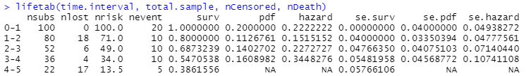 fit.lifetab <- lifetab(time.interval, total.sample, nCensored, nDeath)