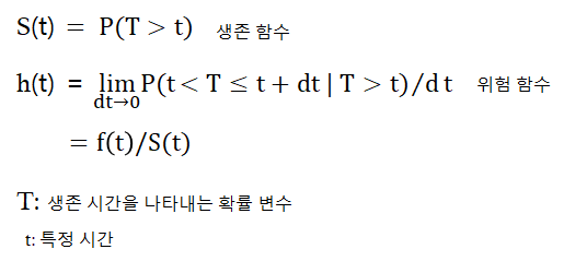 - 위험 함수: t시점까지 생존했다고 가정했을 때 그 직후에 사망할 확률을 나타내는 함수