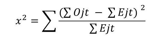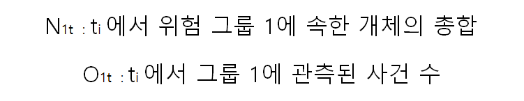 t(i) 시점에서 그룹1의 관측된 사건 수(O(1t))와 귀무 가설 하에서 구한 d(1t)의 기대사건 수 E(1t)의 차이의 합으로 검정 통계량을 구하면 다음과 같음