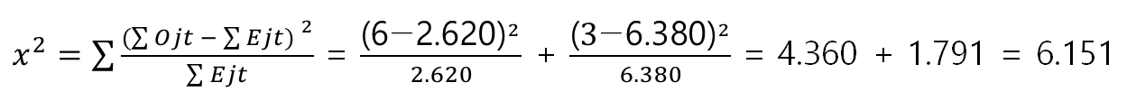 예제 1) 다음 두 그룹의 동질성 검정을 해보자 (df=1, α = 0.05일 때 기각값=3.84)