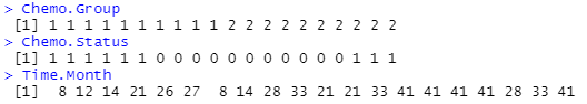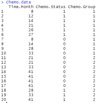 Chemo.data <- data.frame(Time.Month, Chemo.Status, Chemo.Group)