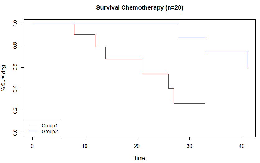 plot(Chemo.plot, xlab='Time', ylab='% Surviving', col=c('red','blue'),