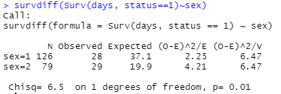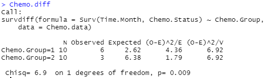 survdiff(Surv(Time.Month, Chemo.Status) ~ Chemo.Group, data=Chemo.data, rho=0)