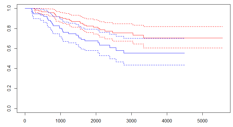 plot(surv.bysex, conf.int=TRUE, col=c("red", "blue")