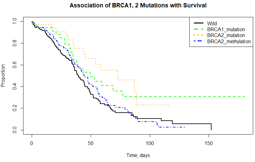 plot(out, col=color, main="Association of BRCA1, 2 Mutations with Survival",
