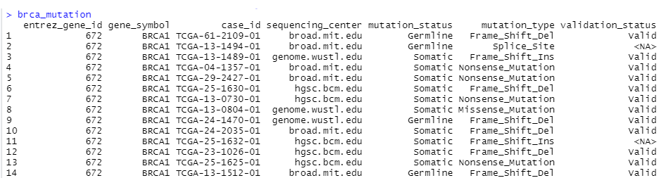 brca_mutation <- getMutationData(mycgds, mycaselist, mymutation, c('BRCA1', 'BRCA2'))
