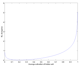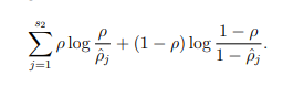 페널티는 위와 같이 추가하는데, 이는 평균이 ρ인 베르누이 확률 변수와 평균이 ρj인 베르누이 확률 변수 사이의 Kullback-Leibler(KL) 발산과 같음. KL-divergence는 서로 다른 두 분포가 얼마나 다른지를 측정하기 위한 표준 함수이며, 이 페널티 함수는 ˆρj = ρ이면 KL(ρ||ρˆj ) = 0이고, 그렇지 않으면 ρj가 ρ에서 멀어짐에 따라 단조 증가함. 즉, 페널티 항을 최소화하면 ˆρj = ρ가 되는 것.